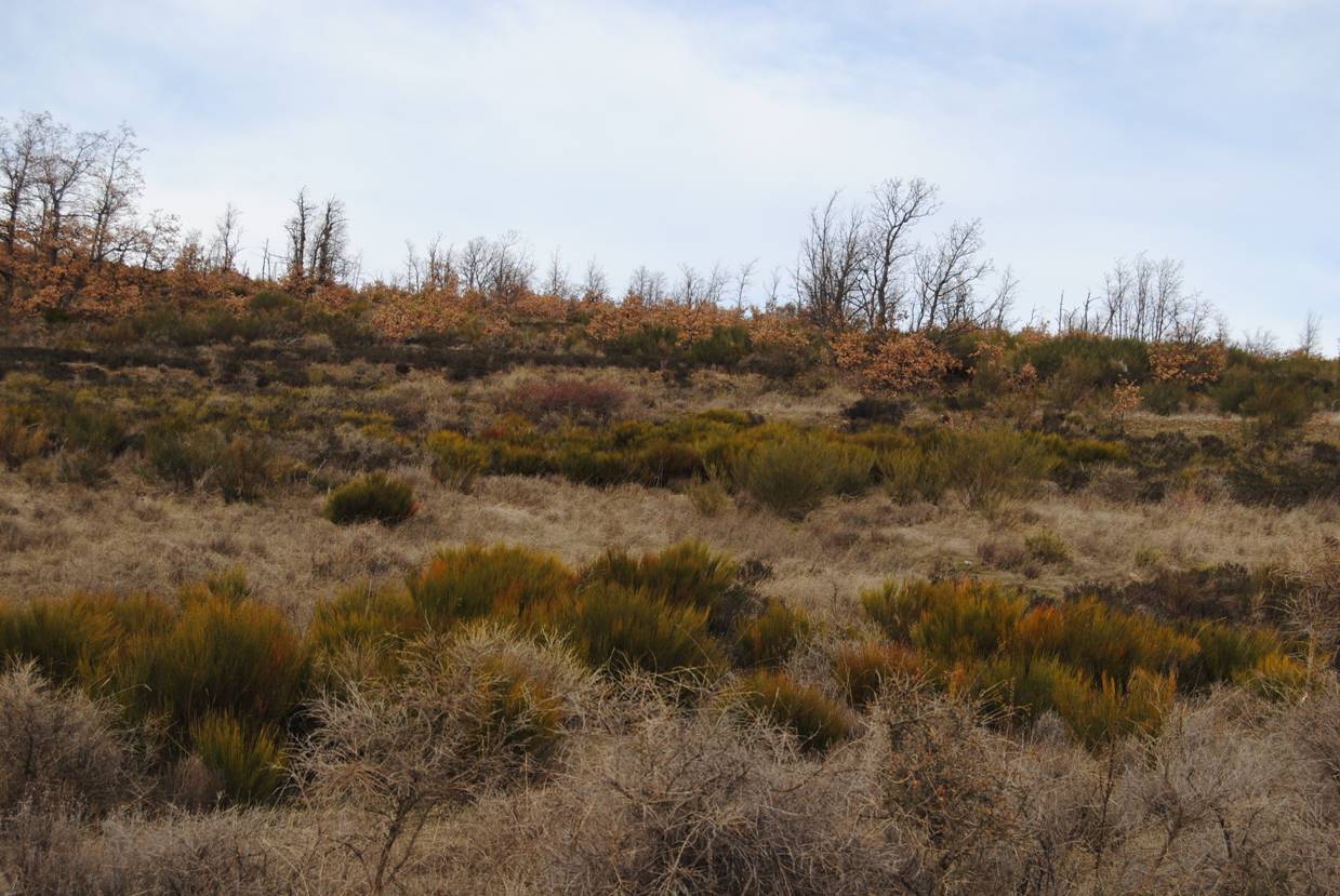 Paisaje con tres estretos de vegetación: en zona superior un bosque de melojos( roble marcescente con hojas secas que permanecen en el árbol hasta la primavera),en tonos verdosos piornal con Genista florida y en el otro extremo ua comunidad espinosa de rosales