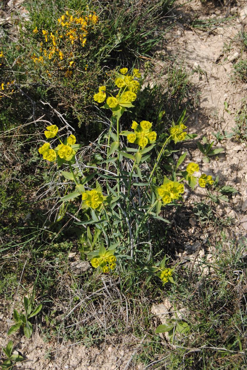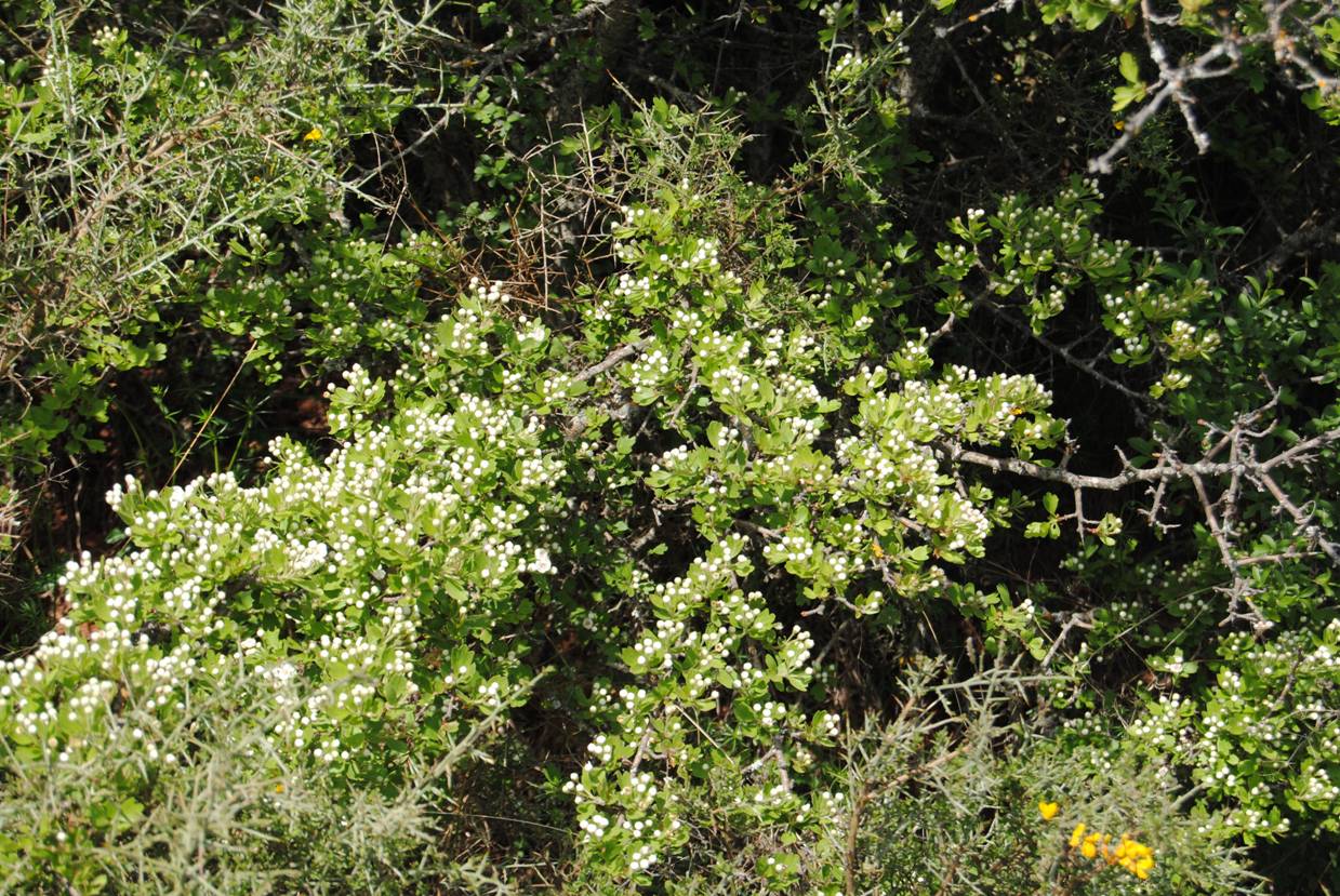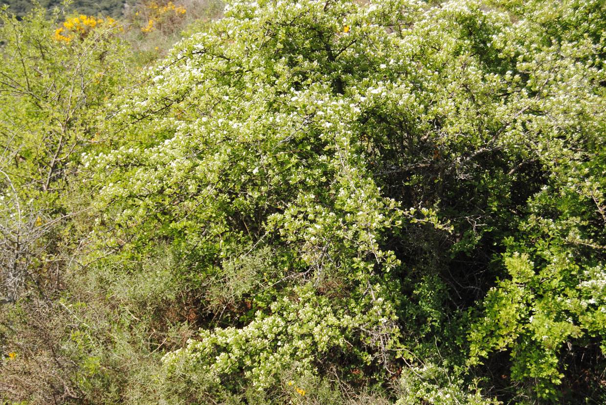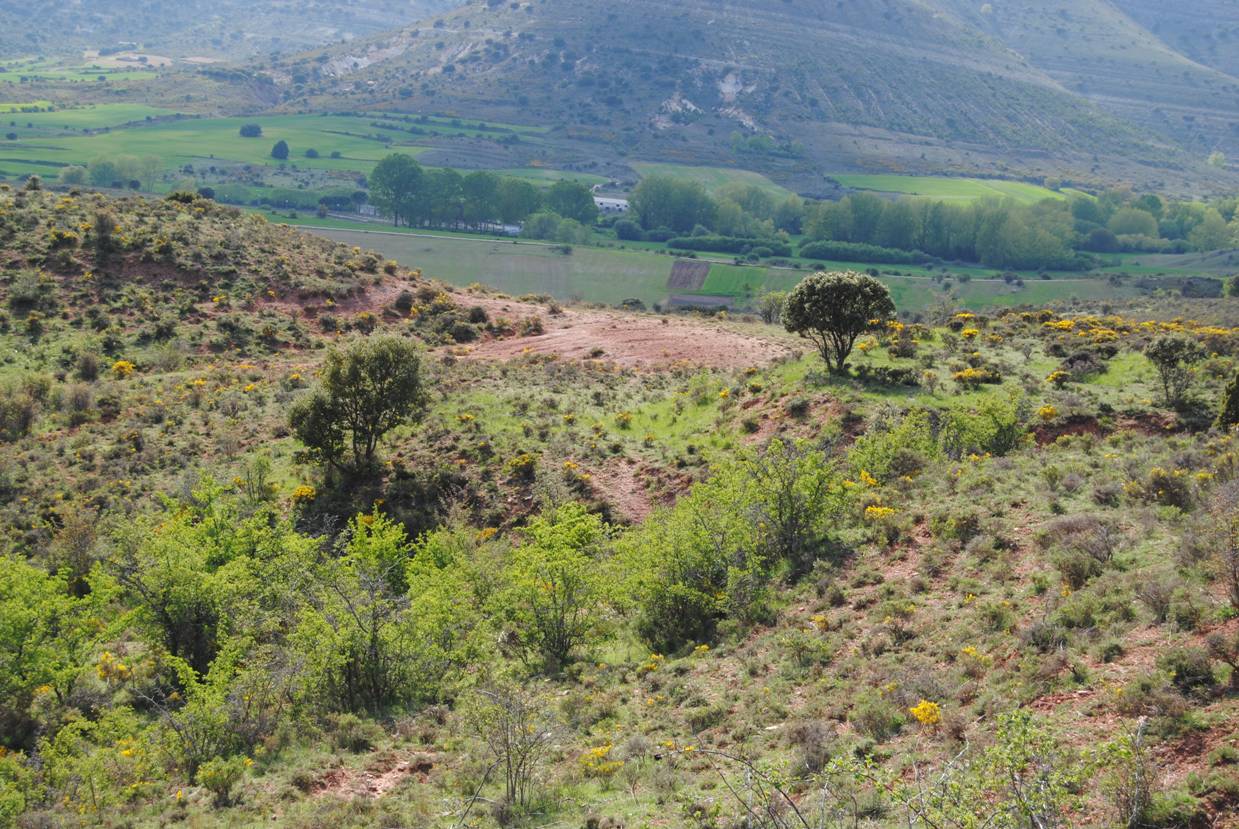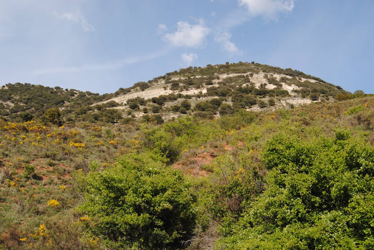 Cerro calizo en la zona superior el encinar sobre calizas blancas y la parte inferior el matorral con el piorno espinoso de flores amarillas,Genista scorpius y el majuelo, Crataegus monogyna