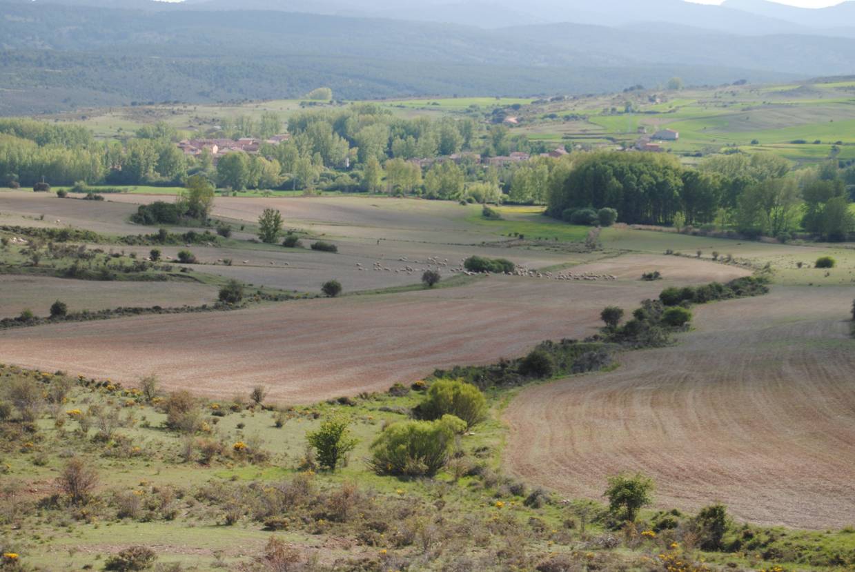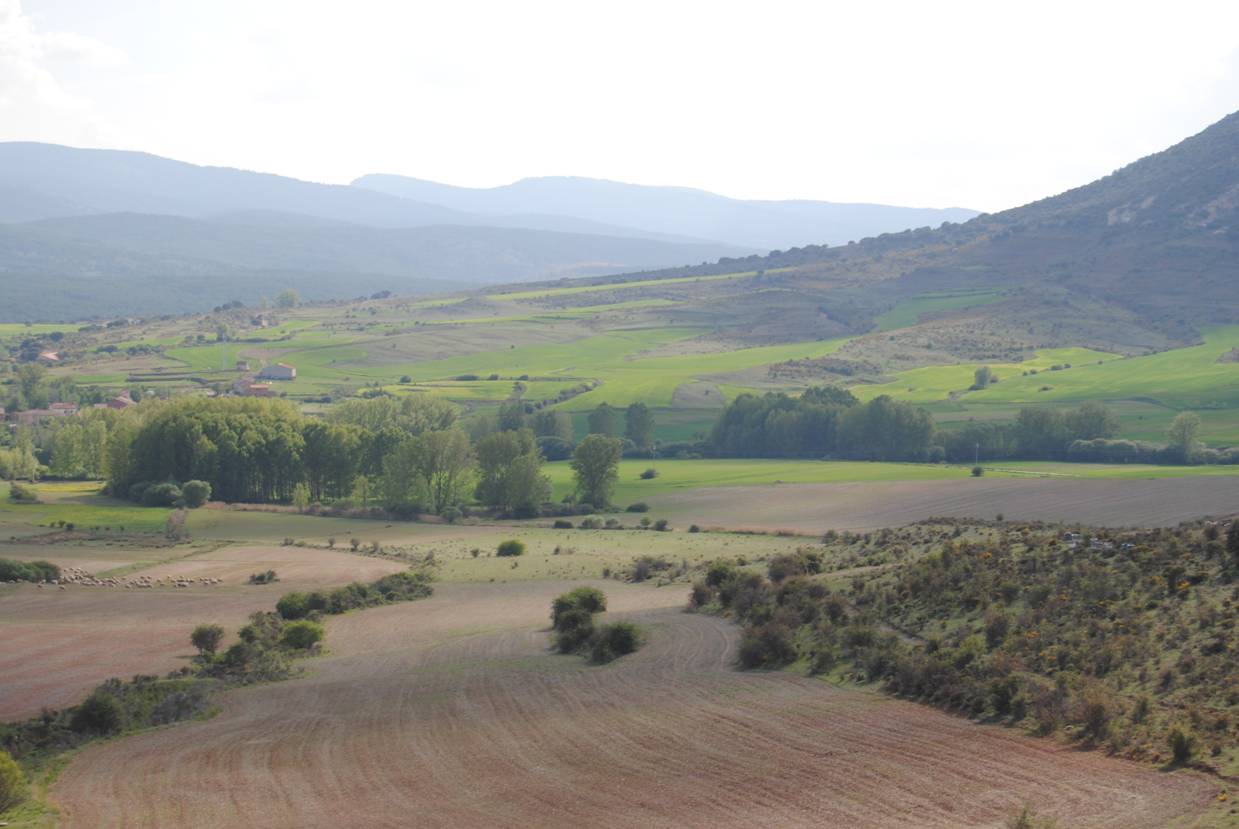 En los cerros las encinas y en la base los chopos en la zona de vega con el cultivo de cereales