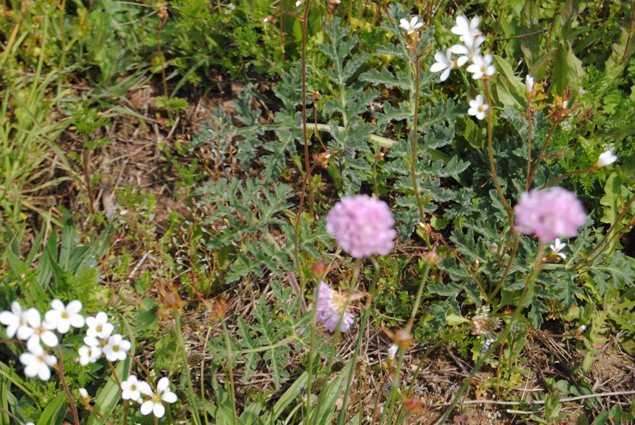 Paisaje con flores de Armeria (en rosa Armeria plantaginea) con hojas de Thapsia villosa y Saxifraga granulata.