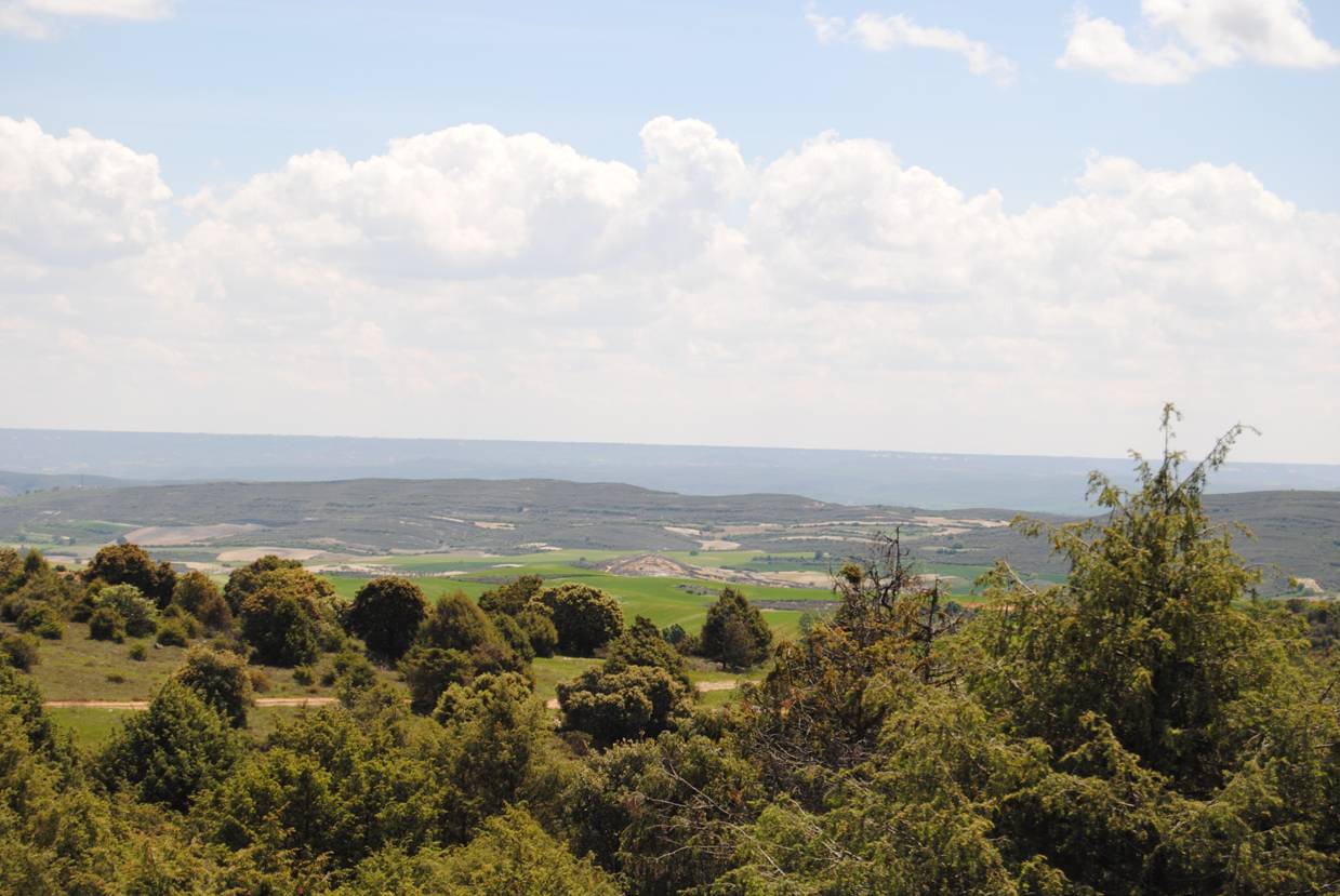 Tipico paisaje castellano,con los encinares verdes y al fondo destacan los cultivos de cereales en verde y en la lejanía los tesos