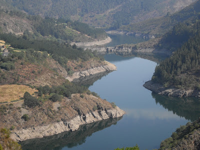 Si desde la aldea de Foxo (que se encuentra a la derecha de esta fotografía) cogieras el camino que junto al rio se dirigia aguas arriba, llegarias enseguidita al puente colgante de Negueira y al poquito de pasar este llegabas al pueblo de San Miguel de Barcela. (cuando el embalse era rio)