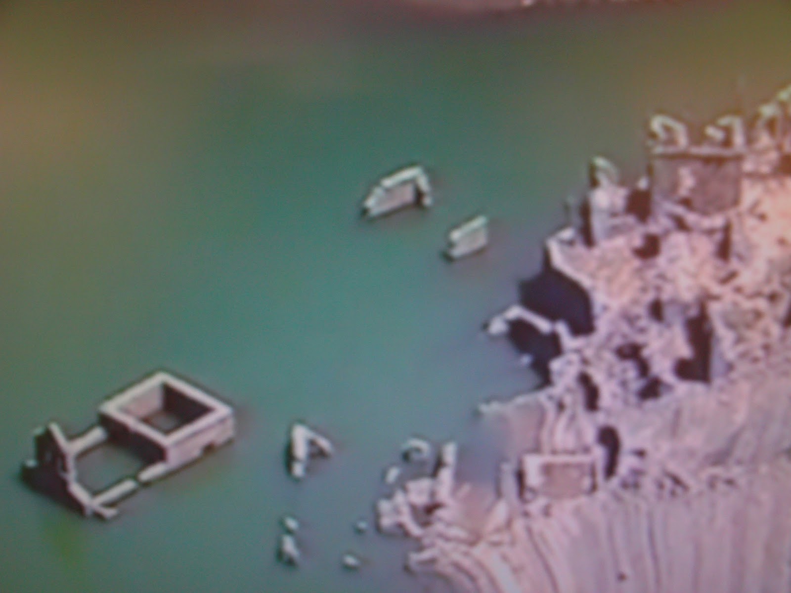 De nuevo el pueblo de Barcela, tras permanecer mas de 50 años bajo el agua, en la parte de arriba de la imagen la única propiedad que quedó fuera del agua. A la parte de abajo la Iglesia y lo que queda de las casas, que como digo un poquito mas arriba eran de las familias de Barcia, Moral, Blanco, Villaverde, Manolón, Bermudez y López.