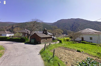 De nuevo el pueblo de Pieiga, vista desde el Street View de Google (la carretera por la parte de acá nos lleva a Negueira de Muñiz y por la parte de allá iriamos a Vilaseca) arriba a la derecha, los montes de Pieiga.