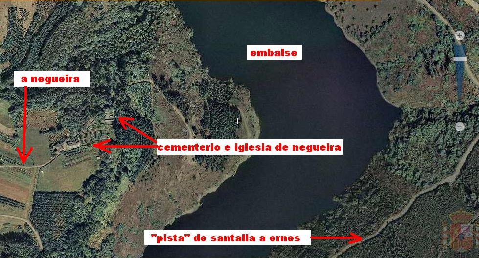 Si salimos desde Negueira, por la carretera mas próxima al pantano, pasariamos por Pieiga y Vilaseca, ambos pueblos estan fuera del alcance del pantano.