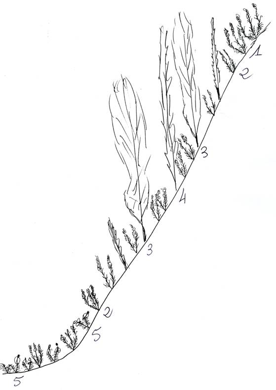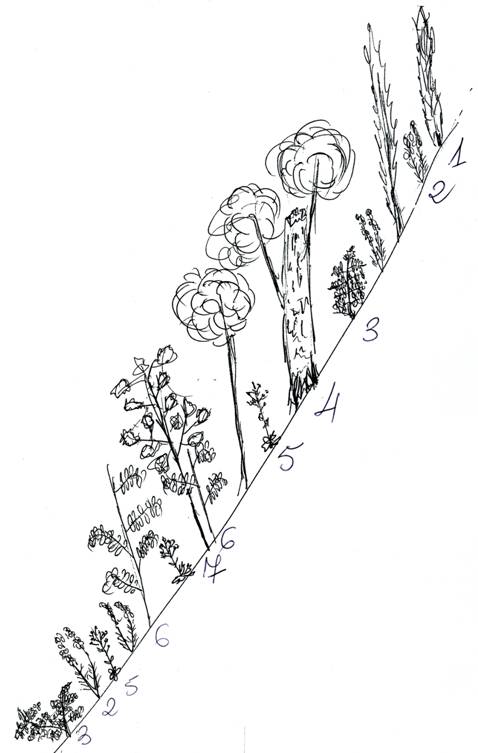 - Erica australis, 2. Erica cinerea, 3. Quercus petraea, 4. Betula pubescens, 5. Ulex gallii