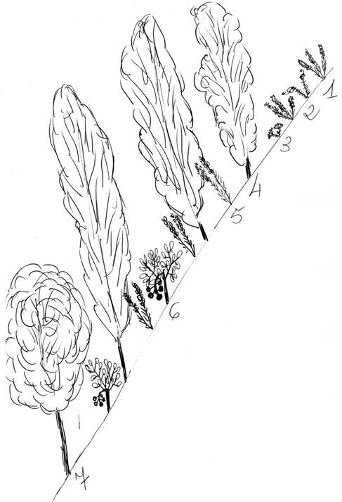 - Betula pubescens, 2. Erica arborea, 3. Dryopteris dilatata, 4. Quercus petraea, 5. Saxifraga spatularis, 6. Sorbus aucuparia, 7. Ilex aquifolium