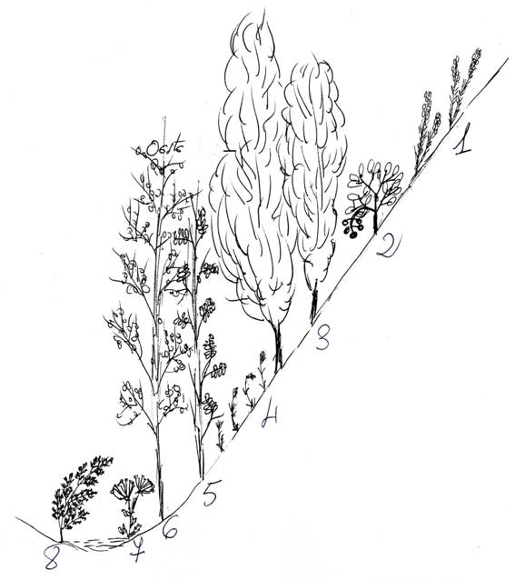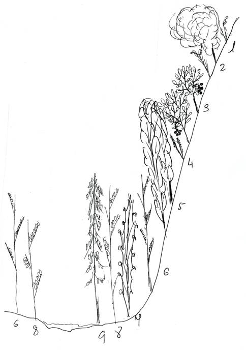 - Erica australis, 2. Arbutus unedo, 3. Quercus pyrenaica, 4. Pastizal de siega, 5. Fraxinus excelsior, 6. Alnus glutinosa, 7.Oenanthe crocata, 8. Athyrium filix-femina