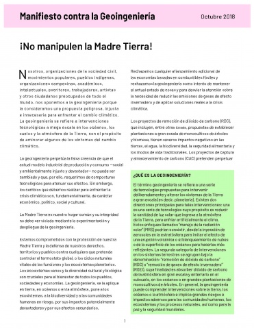110 organizaciones de la sociedad civil y movimientos populares denuncian la geoingenniería y exigen que se suspendan de inmediato los experimentos a cielo abierto. Si su organización quiere unirse a esta lucha contra la geoingeniería y suscribir el Manifiesto ¡Manos fuera de la Madre Tierra!, envíe en correo a manifesto@geoengineeringmonitor.org.