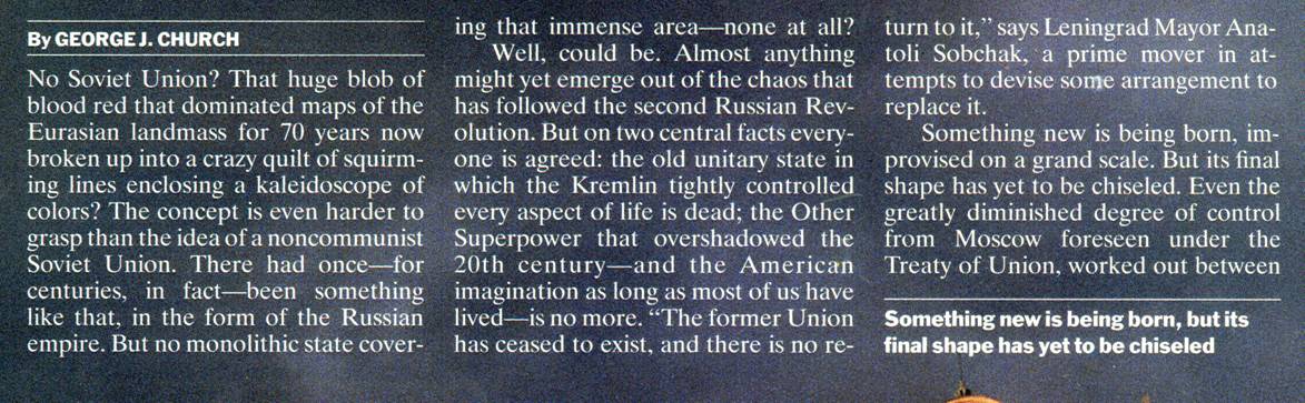 La Unión Soviética colapsaría finalmente en 1991. Tras el fallido golpe de Estado de agosto, los acontecimientos se precipitarían. Gorbachov acabaría dimitiendo el 25 de diciembre,[2] y el el Soviet Supremo reconocería al día siguiente la extinción de la Unión,[3] disolviéndose y asumiendo Rusia los compromisos y la representación internacional del desaparecido Estado