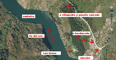 Si desde la aldea de Foxo (que se encuentra a la derecha de esta fotografía) cogieras el camino que junto al rio se dirigia aguas arriba, llegarias enseguidita al puente colgante de Negueira y al poquito de pasar este llegabas al pueblo de San Miguel de Barcela. (cuando el embalse era rio)
