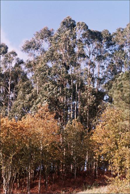 Carvalleda en otoño, detrás repoblación de pinos y eucaliptos
