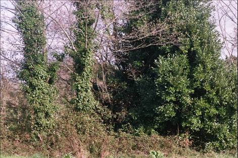 Fragmento de bosque de carvallo con la hiedra rodeando al árbol al lado del laurel