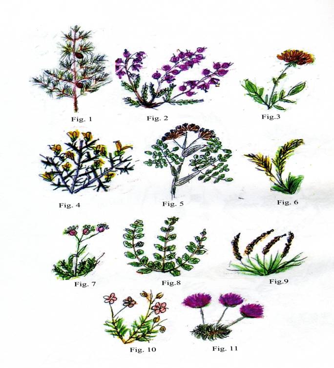 1.Pinus pinaster, 2. Calluna vulgaris, 3. Anthyllis vulneraria, 4. Ulex europaeus, 5. Angelica pachycarpa, 6. Festuca juncifolia, 7.Silene uniflora,