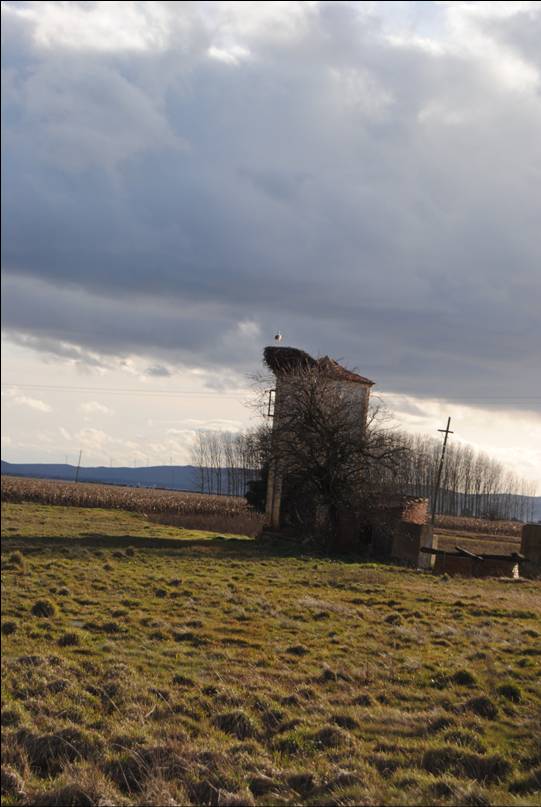 Una cigueña(no confesional) contempla el paisaje desde su nido, sin campanas