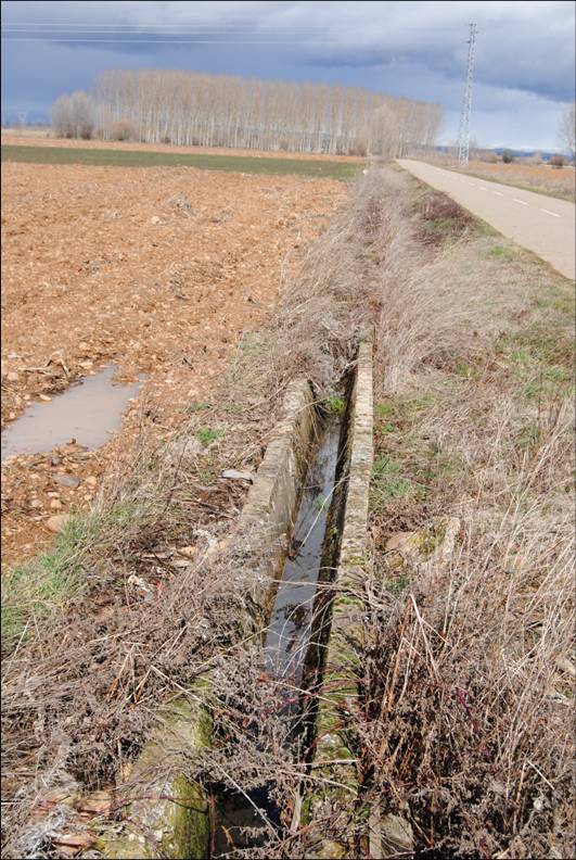 Se observa la acequia y el cultivo de remolacha y de chopos en la vega del Orbigo