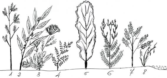 - Fraxinus angustifolia, 2. Laurus nobilis, 3. Chaerophyllum hirsutum, 4. Athyrium filix- femina, 5. Alnus glutinosa, 6. Osmunda regalis, 7. Fraxinus excelsior, 8. Carex pendula