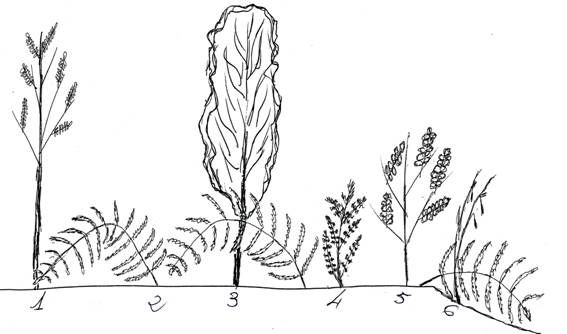 - Fraxinus angustifolia, 2. Woodwardia radicans, 3. Alnus glutinosa, 4. Athyrium filix- femina, 5. Fraxinus excelsior, 6. Carex pendula