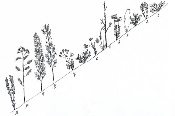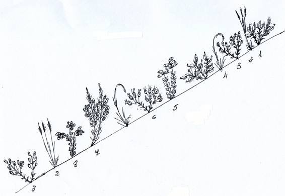 - Ulex gallii, 2. Agrostis cutisii, 3. Erica cinerea, 4. Pseudarrhenatherum longifolium, 5. Erica ciliaris, 6. Erica umbellata, 7. Erica vagans, 8. Erica mackaiana