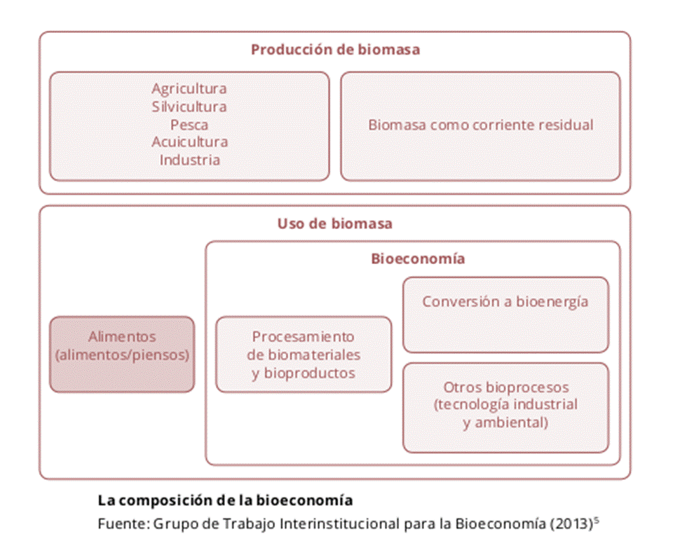 la bioeconomía abarca la producción y el uso de recursos biológicos renovables así como actividades económicas, ya sea en un país o entre países, relacionadas con la invención, el desarrollo, la producción y el uso de productos y procesos biológicos. Esto entrañaría, por ejemplo, la producción de cultivos con fines alimenticios y no alimenticios, y los procesos tecnológicos que los transforman en alimentos, piensos, bioproductos, agrocombustibles y bioenergía. La bioeconomía, además, comprende numerosos sectores: agricultura, silvicultura, pesca, construcción, procesamiento de alimentos, pasta y papel, biotecnología, tecnología ambiental, bienes industriales, textiles, productos químicos y farmacéuticos, y reciclaje y recogida de residuos. 2