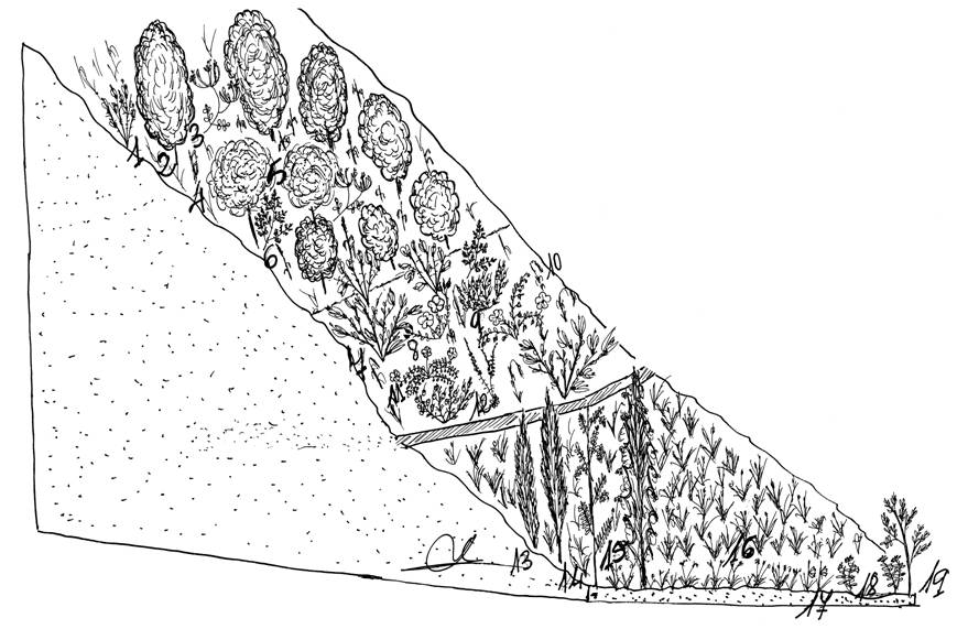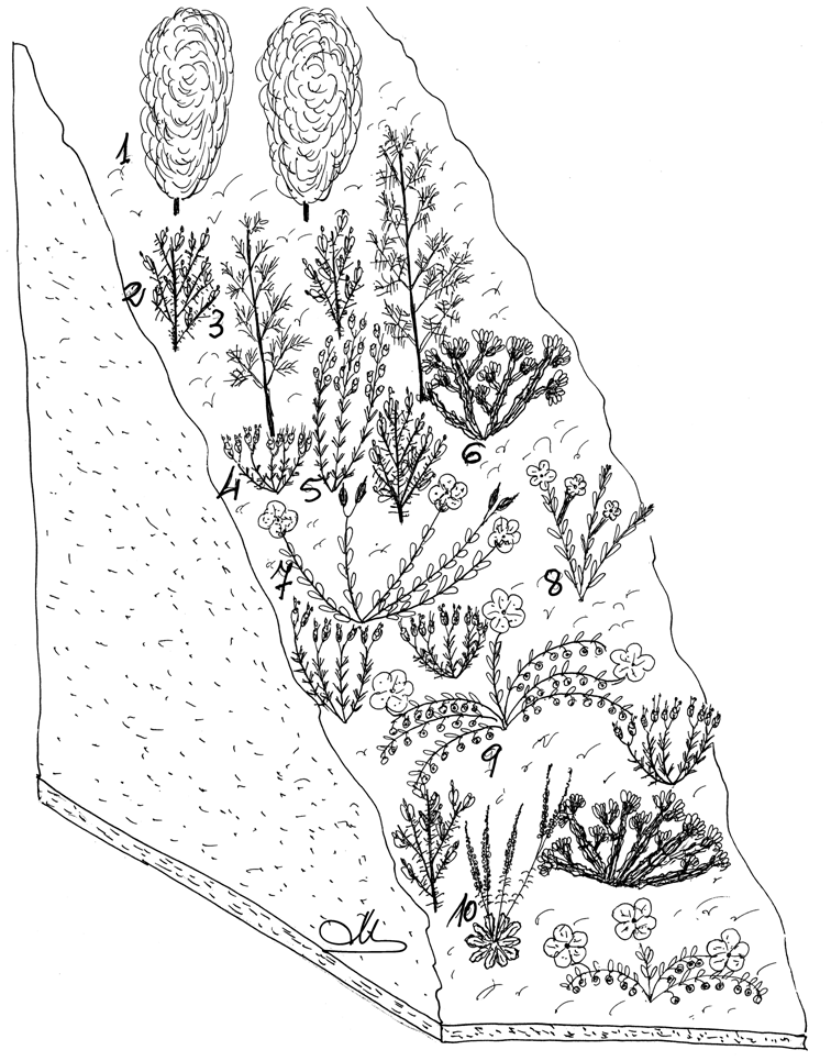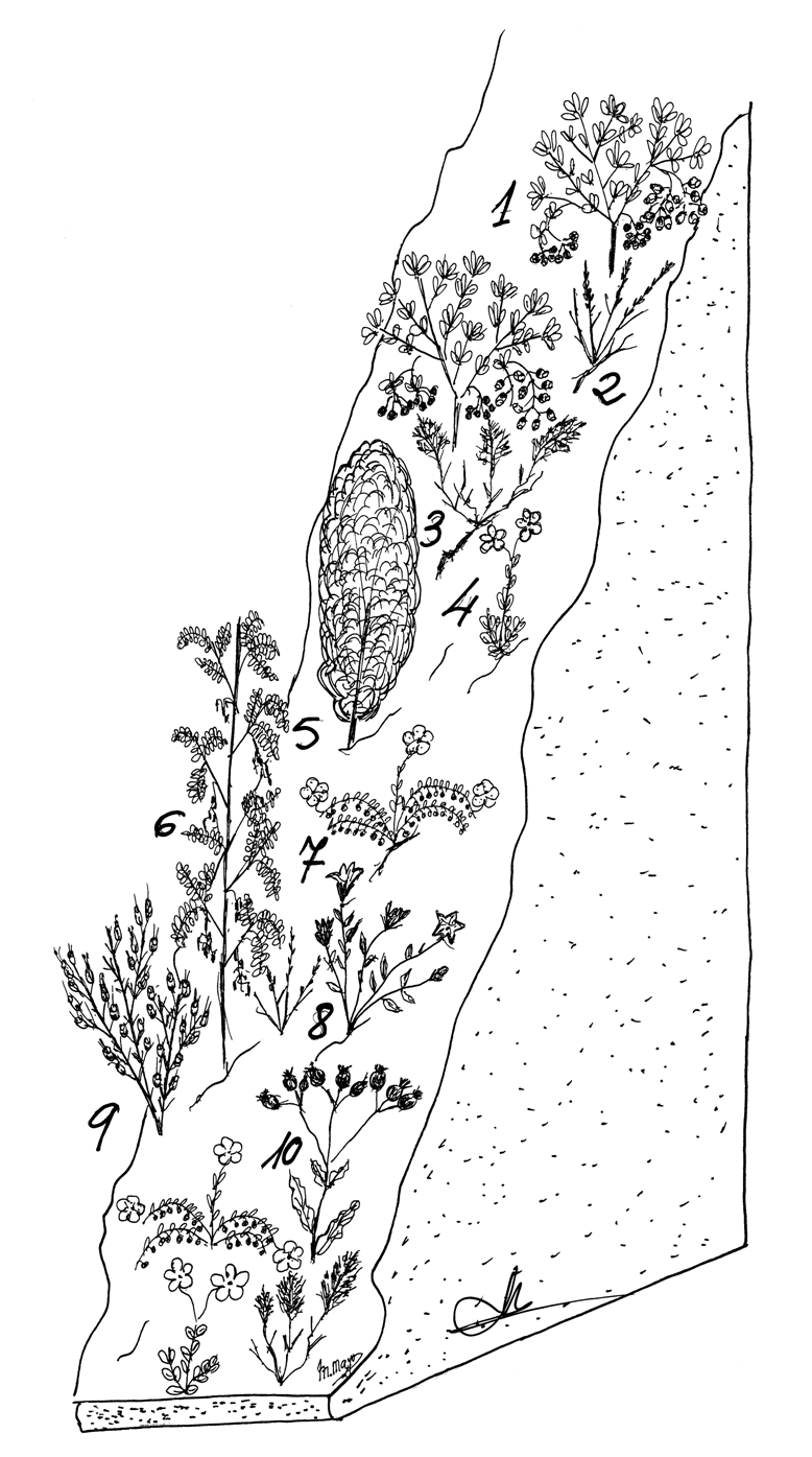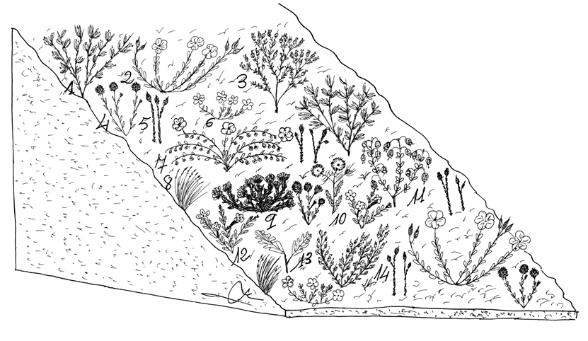 – San Antolín de Ibias (Ibias, Asturias), UTM huso 29T (m) X=673780, Y=4767528, 293 m, exp. W. 1. Cytisus multiflorus, 2. Halimium alyssoides, 3. Erica australis subsp. aragonensis, 4. Jasione montana, 5. Logfia minima, 6. Arenaria montana, 7. Helianthemum tinetense, 8. Carex distachya, 9. Genistella tridentata, 10. Tolpis barbata, 11. Daboecia cantabrica, 12. Lithodora prostrata, 13. Quercus pyrenaica (pl.), 14. Erica cinerea. (Dibujo de M. Mayor).