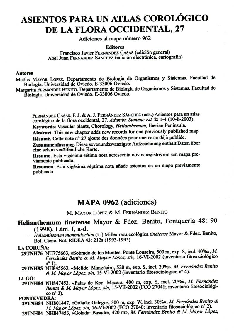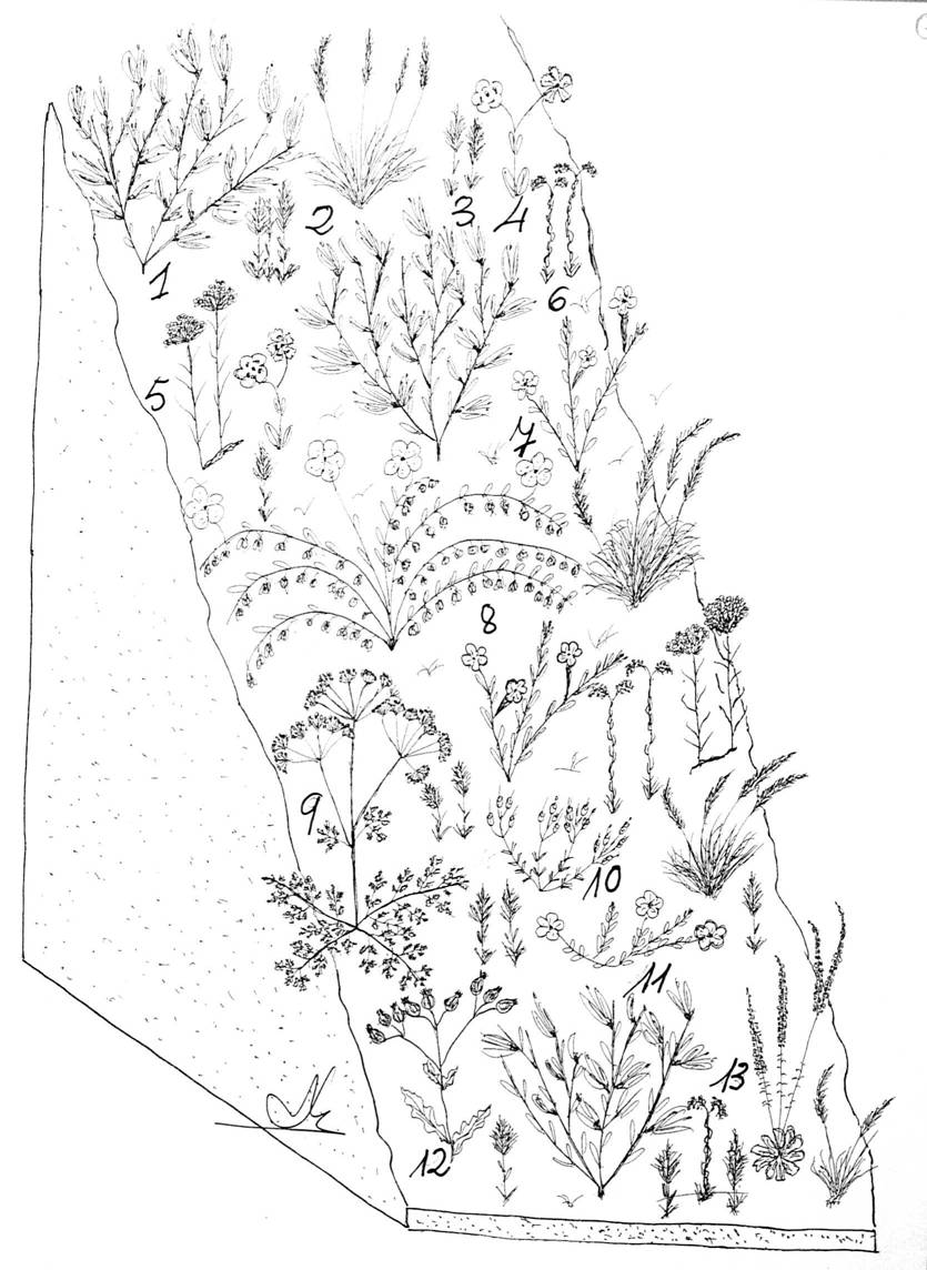 – Grandas de Salime (Asturias), UTM huso 29T (m) X=673911, Y=4785440, 225 m. exp. SE. 1. Cytisus multiflorus, 2. Festuca indigesta, saltem s.l., 3. Anthoxanthum aristatum, 4. Tuberaria guttata, 5. Erysimum linofolium, 6. Sedum forsterianum, 7. Lithodora prostrata, 8. Helianthemum tinetense, 9. Tapiza villosa, 10. Erica cinerea, 11. Arenaria montana 12. Senecio lividus, 13. Anarrhinum bellidifolium. (Dibujo de M. Mayor).