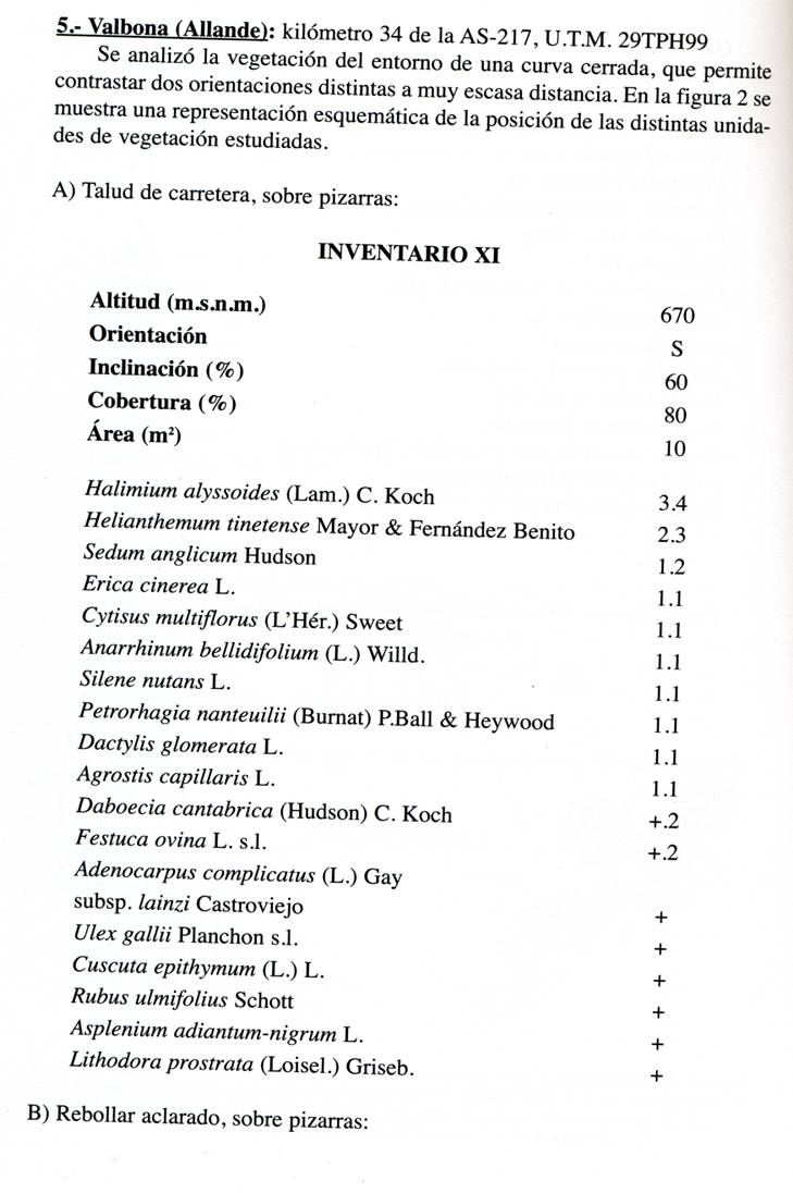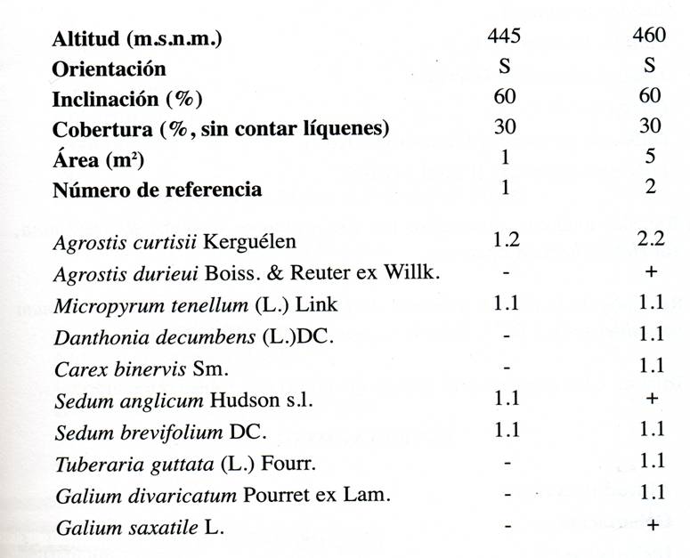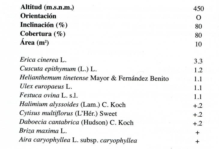 Especies solo presentes en un inventario: Teesdalia nudicaulis 1.1 en 2. Quercus robur 2.2, Cistus psilosepalus 2.3, Daboecia cantabrica 1.2, Centranthus calcitrapae 1.1, Hypericum pulchrum y Lactuca serriola +, en 3. Ulex gallii, 3.4, Erica australis subsp. aragonensis 3.3, Teucrium scorodonia 1.1, Cytisus scoparius +.2 y Pseudarrhenatherum longifolium + en 4. Hypericum linariifolium 2.2 en 5. Logfia minima 1.1 y Silene nutans + en 6. Corrigiola telephiifolia 1.1, Sesamoides suffruticosa 1.1 y Saxifraga clusii subsp. lepismigena (+) en 8. Asplenium onopteris + en 9.